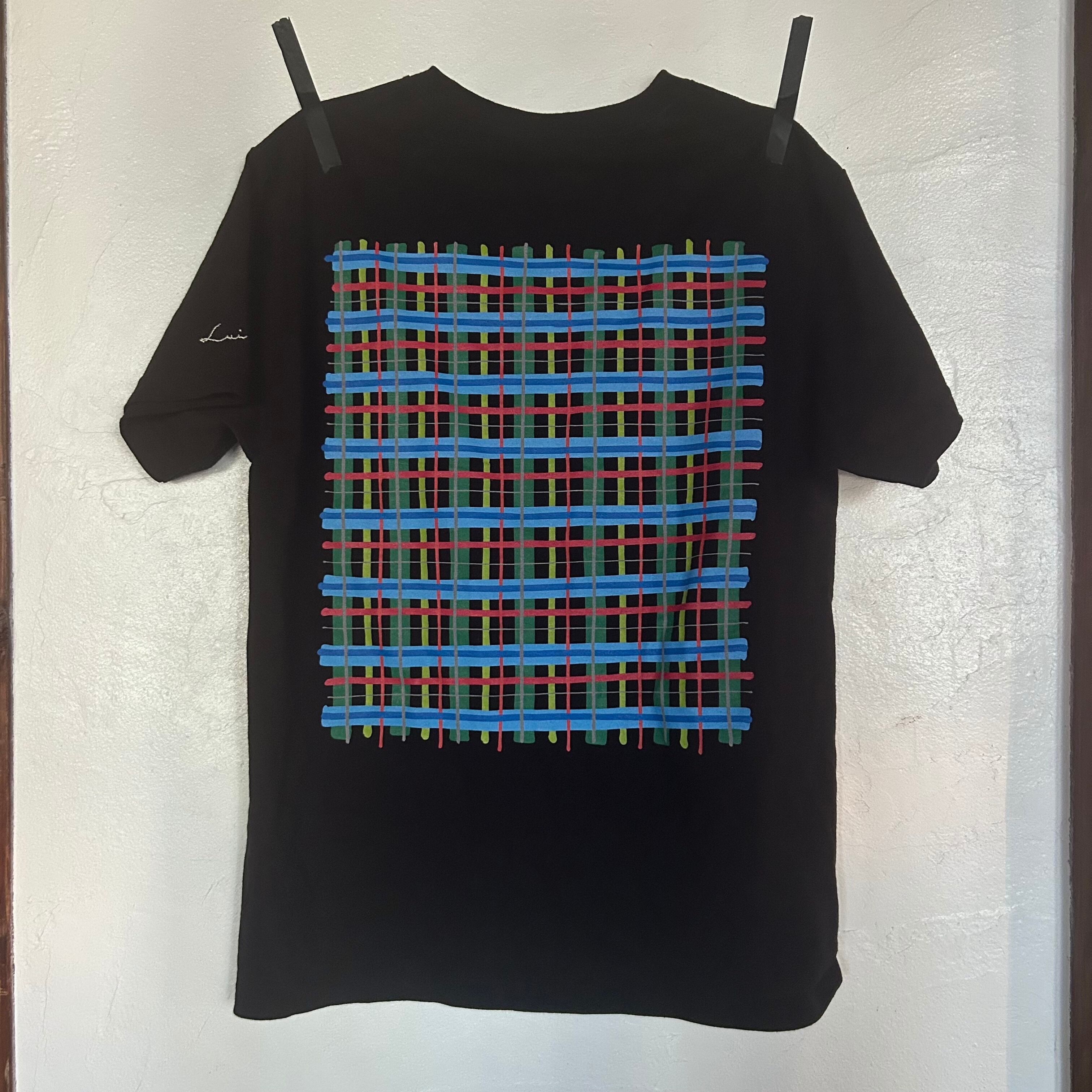 大判のチェック模様のバックプリントは
